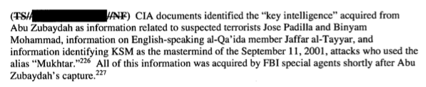 El informe sólo constata oficialmente lo que ya sabíamos extraoficialmente. Por ejemplo, el ex-agente de origen libanés del FBI Ali Soufan habló de las torturas en su libro The Black Banners. Hice una reseña del libro en septiembre de 2013. Según Soufan, las torturas fueron inútiles para obtener información veraz y aprovechable. Además fueron aplicadas de forma chapucera y los torturados terminaron confesando a sus interrogadores datos erróneos que encajaban en lo que estos últimos querían escuchar. Ayer, Ali Soufan publicó en Twitter el siguiente recorte extraído del informe, donde se habla que la información «clave» obtenida mediante tortura a Abu Zubaydah ya había sido obtenida por agentes del FBI.