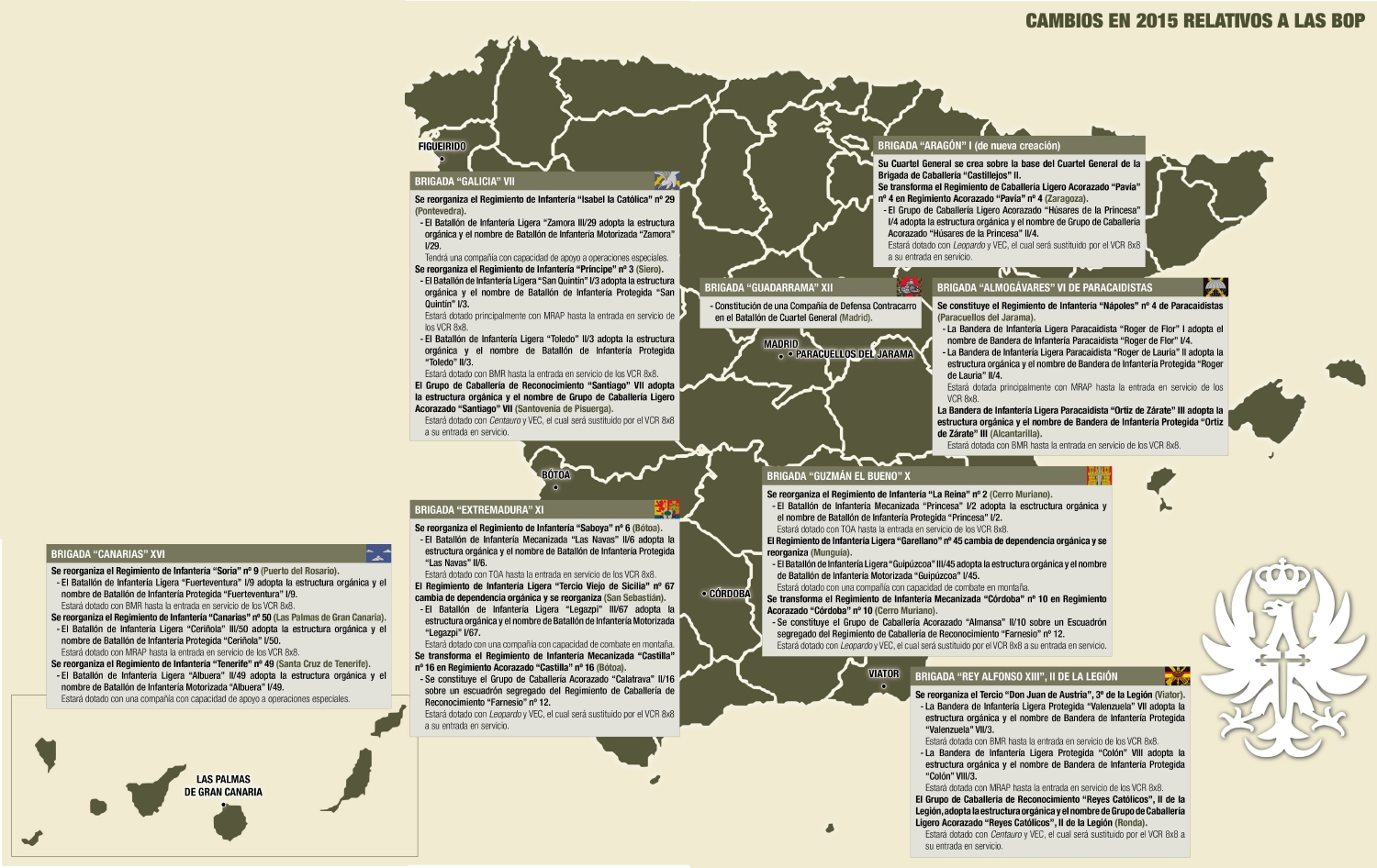 Otro problema era que ante la sobrecarga de misiones exteriores que sufrían  las unidades ligeras se empezó a recurrir a la tropa de unidades mecanizadas y de artillería para realizar misiones de patrulla como infantería en lugares como Kosovo y Líbano. La solución ha sido crear unidades con una cierta naturaleza modular en las que haya unidades mecanizadas, medias y ligeras. Es decir, en pleno 2015 el Ejército de Tierra español ha inventado la ¡Brigada de Infantería de Marina!. Pero como dice el dicho, hay tres maneras de hacer las cosas: bien, mal y a la manera del Ejército. Así que con la actual reforma se disuelve la Brigada de Infantería Ligera «San Marcial», una unidad infradotada y anémica repartida por el País Vasco, para que el Regimiento de Infantería Ligera «Tercio Viejo de Sicilia» en Guipuzcoa dependa de la brigada «Extremadura» en Badajoz y el Regimiento de Infantería Ligera «Garellano» en Vizcaya dependa de la brigada «Guzmán el Bueno» en Córdoba.