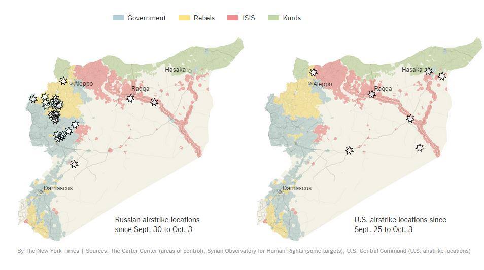 En cualquier caso, la clave está en que Rusia ha reconocido abiertamente que está atacando las posiciones tanto del Estado Islámico como del frente Al-Nusra. Sin embargo, en el mapa del New York Times se omiten las posiciones de Al-Nusra.