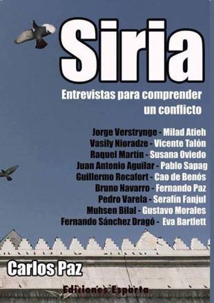 El libro Yihadismo wahabita de Galiana Ros fue publicado por la editorial Ediciones Esparta, uno de cuyos temas principales es Falange y el fascismo español. Allí encontramos el libro Siria: Entrevistas para comprender un conflicto cuyo autor es Carlos Paz, presidente del Frente Europeo de Solidaridad con Siria. Entiéndase, la Siria de Bashar Al Assad. El autor del libro, Carlos Paz, cuenta en esta entrevista que varios miembros de la organización han viajado en diversas ocasiones a Siria. Ciertamente, la conexión español-siria, en la que participan comunistas y fascistas daría para otra entrada de blog [véase «La conexión siria»]. Pero aquí me interesa la lista de entrevistados en el libro.