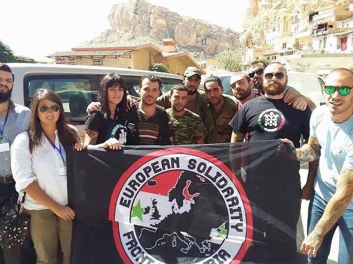 En la anterior foto que me ha proporcionado @jorgecamarero vía Twitter, se puede ver a la izquierda a una chica con la camiseta del HSM y a la derecha un chico con una camiseta de Casa Pound. Suponemos que la foto se tomó en Siria. Delante vemos la pancarta del European Solidarity Front for Syria. Y es que la organización española no es más que la encarnación local de una organización presente en varios países. Y es que el fenómeno se repite en Europa. Véase «Assad’s far-right Europe corps?» de 2013 y «Europe’s far-right activists continue to throw their weight behind Syria’s Assad» (2015). En España el asunto fue abordado por Cristina Torrent en «Asad y sus camaradas fascistas» (2016).