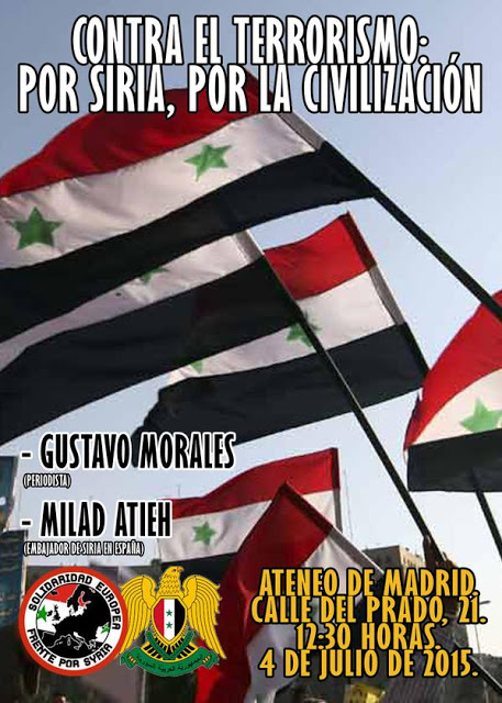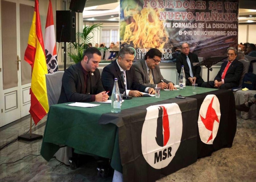 Posiblemente uno de los partidos de ultraderecha más activos sobre Siria sea el Movimiento Social Republicano (MSR), que aquí definen como «partido político patriota que se decanta por el socialismo nacional revolucionario». En su página web podemos encontrar textos como «Siria no se toca» o «Con el Partido Social Nacionalista Sirio», partido fascista del que ya he hablado anteriormente en este blog. Uno de sus miembros, el abogado libanés Adnan Ezzedine, ha participado en varios actos del MSR sobre Siria. Por ejemplo, encontramos que el 15 de junio de 2013 se celebró una mesa redonda en Valencia con el título «¿Qué está pasando en Siria» en la que participó Ezzedine con miembros del MSR. Ese mismo año participó también con el MSR en las VIII Jornadas de la Disidencia, donde estuvo también estuvo Hassan Sakr, responsable de relaciones exteriores del partido y al que encontramos de visita en Moscú recientemente. La participación del Partido Social Nacionalista Sirio en unas actividades en España sucedió después de que una delegación del MSR viajara al Líbano.