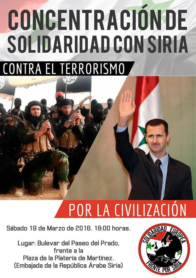 El cartel con la convocatoria a esa concentración del 19 de marzo de 2016 organizada por el Frente Europeo de Solidaridad con Siria fue difundida en Twitter por los Verdes Madrid, organización republicana de izquierdas que simpatiza con el chavismo y con el Frente Democrático para la Liberación de Palestina.