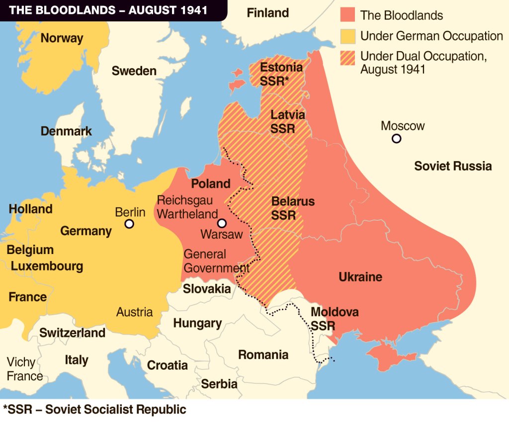 El estudio comparado de las acciones estalinistas y nazis se demuestra en el libro que tiene sentido porque por un mismo territorio sufrió la acción de unos y otros en un intervalo de pocos años, además de cómo las acciones de la Unión Soviética y la Alemania nazi se interrelacionan. Por ejemplo, la Unión Soviética alentó el levantamiento de la resistencia polaca en Varsovia en 1944 sólo para dejar que fuera aplastada por los alemanes. El objetivo soviético era que los alemanes hicieran el trabajo sucio de acabar con las fuerzas nacionalistas polacas y así no encontrar luego una oposición a su dominio. Todo aquel que tomó la iniciativa para luchar contra los nazis se convirtió en un futuro potencial enemigo del régimen estalinista. El fin de la guerra, no sopuso la paz para los supervivientes. La población polaca de los territorios anexionados por la Unión Soviética en 1945 fue expulsada, como lo fue la población alemana de los territorios que pasaron a Polonia a partir de 1945 también. Los supervivientes del Holocausto se encontraron con sus casas ocupadas por nuevos inquilinos o simplemente decidieron no retornar a sus lugares de origen, donde habían sido delatados por vecinos. El libro se cierra con la gran purga de judíos en la Unión Soviética y países satélites que fue interrumpida por la muerte de Stalin.