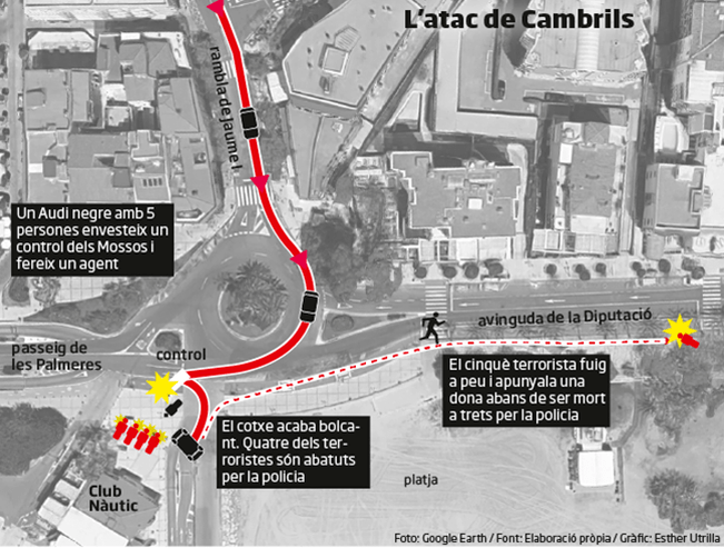 Uno de los miembros de la célula tomó el Audi A3 de su hermano y con otros cuatro miembros se dirigió a Cambrills en la madrugada del viernes. Se encontraron un control de los Mossos en la rotonda frente al Club Náutico y se lanzaron contra él a toda velocidad, hiriendo un agente que sufrió una fractura de tibia y un golpe en la cabeza. El vehículo terminó volcando y arrollando a varias personas. Una de las víctimas murió en el hospital. Otra versión dice que las personas fueron arrolladas antes de chocar contra el control.