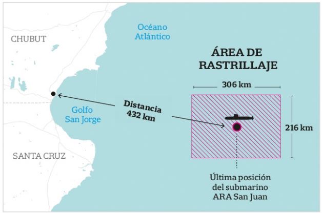 La última posición conocida del submarino «San Juan» estaba a 240 millas náuticas de la costa argentina en el Golfo de San Jorge. Según contó ayer domingo el diario argentino La Nación, el área de búsqueda lo formaba un rectángulo sobre el mapa de 306 x 216 kilómetros de área. Para una misión así era de esperar que se enviara el avión de patrulla marítima por antonomasia: el Lockheed P-3 Orión.