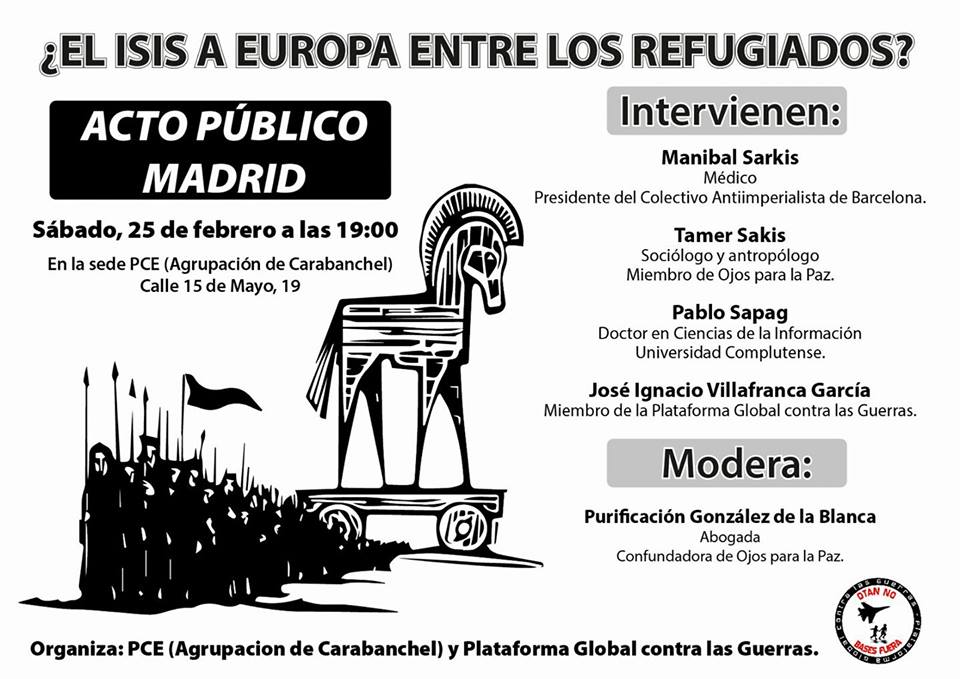 Mi reciente aproximación al tema surgía de casos puntuales de comunistas y radicales de izquierda con puntos de vista sobre la inmigración o el feminismo que los hacía indistinguibles de la alt-right. Me parecían un síntoma de algo más profundo. Y «Millán Fernández» me hizo anoche una aportación valiosísima. Resulta que alguien se había molestado en redactar un documento que mostraba cómo la Plataforma Global Contra las Guerras, a fuerza de coincidir con la ultraderecha española en críticas a Estados Unidos y la OTAN a cuenta de la guerra de Siria, había terminado asumiendo su discurso. Vean el siguiente evento coorganizado por el Partido Comunista de Madrid en Carabanchel y la Plataforma Global Contra las Guerras en febrero de 2017.
