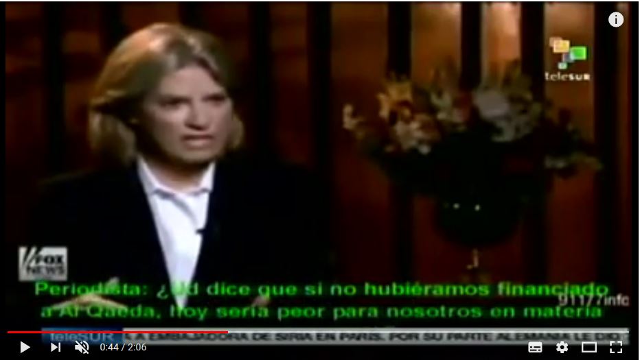 TeleSur, el consorcio público de varios países hispanoamericanos, ofrece el vídeo titulado «Hillary Clinton admite que EE.UU. creó Al Qaeda». Se trata del fragmento de una entrevista a Hillary Clinton en Fox News el 18 de julio de 2010.