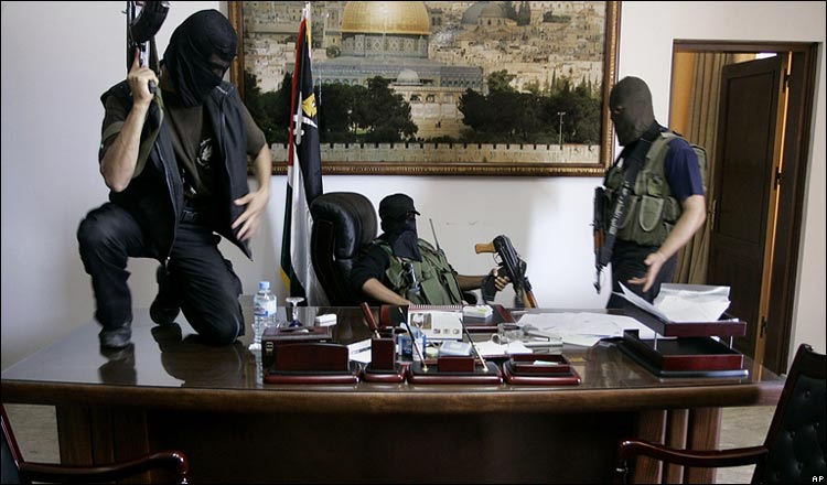 Miembros de HAMAS tras tomar un edificio de la Autoridad Palestina.