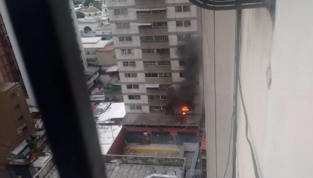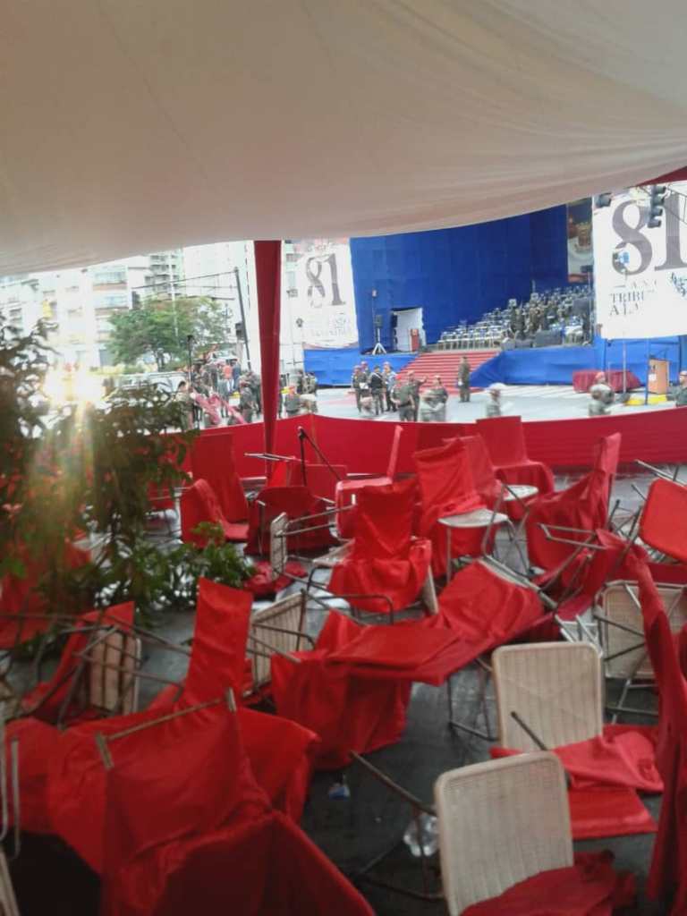 En medio del discurso, a las 17:41 hora local, se oyeron dos explosiones. Las fotos en Twitter mostraron una columna de humo y fuego saliendo por la ventana de un edificio. Más tarde, algunos medios recogerían la versión de que se trató de una explosión de una bombona gas en un edificio cercano, citando como fuente a bomberos de Caracas.