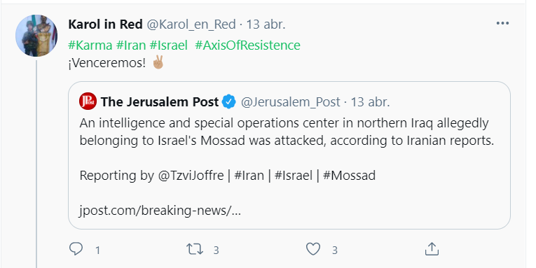 Concluyo con este maravilloso intercambio de tuits. «Karol en Red» comparte una noticia del Jerusalem Post, que cita fuentes iraníes, sobre un supuesto ataque contra una base de operaciones del Mossad en el norte de Iraq. Se decía que había bajas entre los agentes israelíes y que pronto habría imágenes.