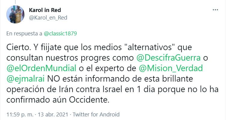 «Karol en Red» echa en falta que medios «alternativos» de habla hispana como El Orden Mundial, Descifrando La Guerra y Misión Verdad se hagan eco de la noticia. Que a saber si se llegaron a enterar de su existencia. Pero «Karol en Red» tiene clarísimo que es porque están esperando confirmación de algún medio occidental. Aunque un tal @classic1879 apunta que no lo hacen porque están esperando instrucciones de Israel. Verdad verdadera. Cuestionar los medios y gobiernos occidentales para terminar creyendo cualquier cosa.