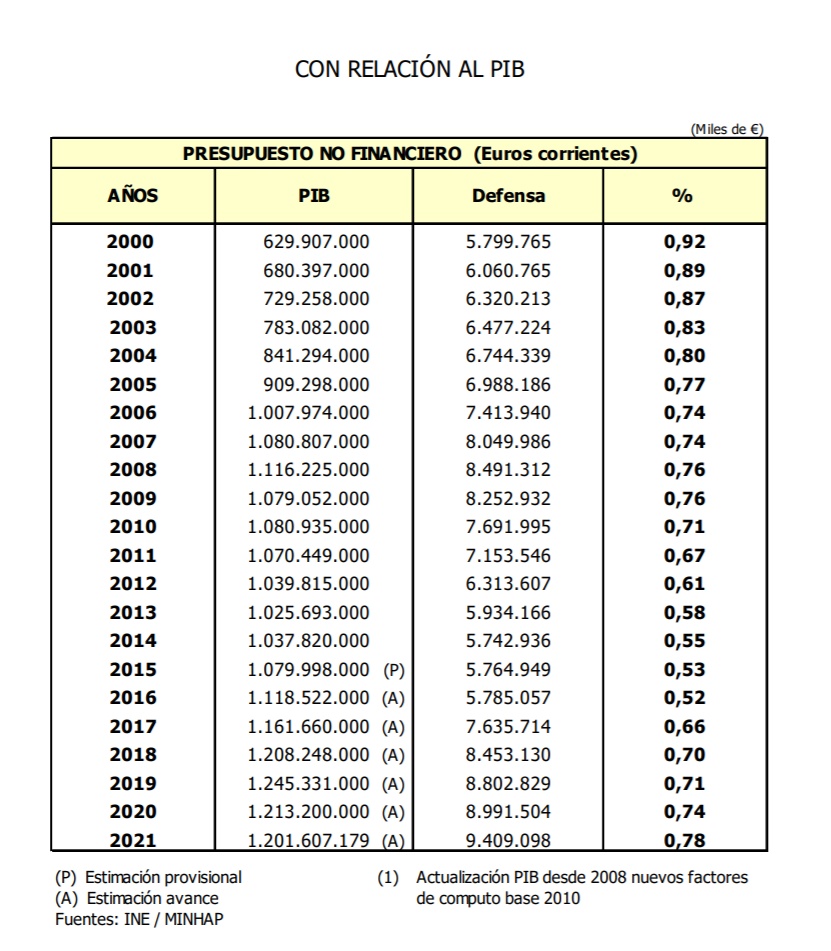 El presidente Pedro Sánchez mencionó en la entrevista que ya estaba prevista una subida del gasto de Defensa del 1,25% al 1,40% del P.I.B. Cómo no, esos datos tienen truco. No corresponden a los criterios de la OTAN para contabilizar el gasto de defensa, sino a un criterio más laxo que incluye hasta los gastos en pensiones de personal militar para contabilizar el gasto militar y que usan algunas organizaciones civiles. Además, la subida del gasto de defensa en España tiene que ponerse en el contexto del hachazo sufrido los presupuestos militares tras la crisis financiera de 2008. Por tanto, la subida del gasto de defensa tiene que considerarse como una recuperación y no como una expansión.