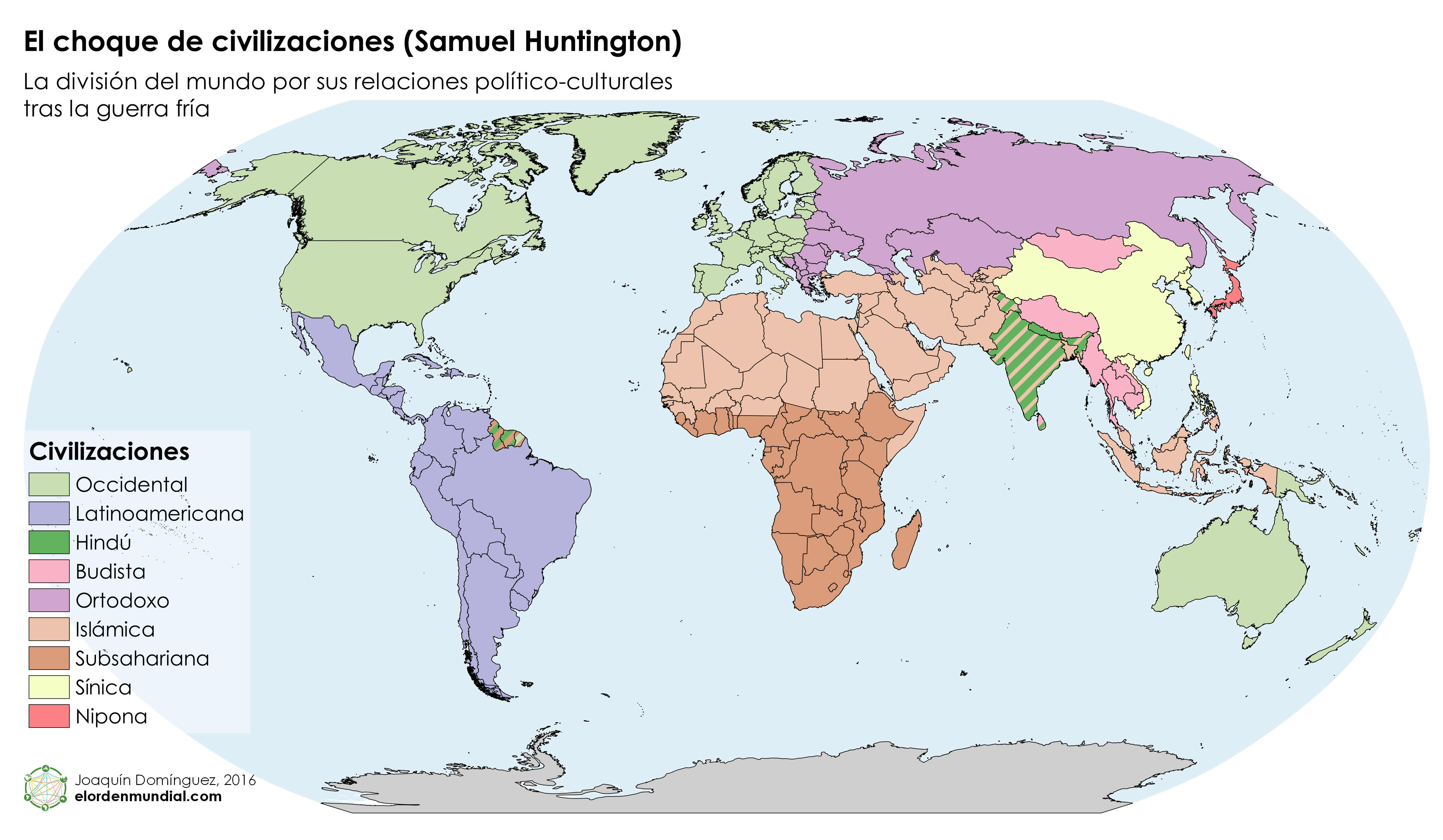 El Choque de Civilizaciones apareció pocos años después de la caída del Muro de Berlín. Fue previamente, exactamente igual que El fin de la historia, un artículo de revista donde el título aparecía entre interrogantes. La idea de partida era interesante. Frente al optimismo de los que pensaban que entraríamos en una nueva era de paz y prosperidad porque ya no había una brecha ideológica entre dos bloques enfrentados, Hungtinton advertía que no debíamos confundirnos con la aparente «occidentalización» del mundo. Los jóvenes de casi todo el mundo vestirán pantalones vaqueros, escucharán música de artistas internacionales que cantan en inglés y su ocio girará en torno a series, películas, videojuegos, etc., procedentes de la industria de entretenimiento occidental. Pero debajo de esa superficial uniformidad se esconden valores y formas de ver el mundo que no tienen nada que ver con Occidente. Así que era de esperar que en el futuro los países no occidentales fueran cada vez más asertivos en la defensa de sus intereses estratégicos y es posible que terminaran chocando con Occidente.