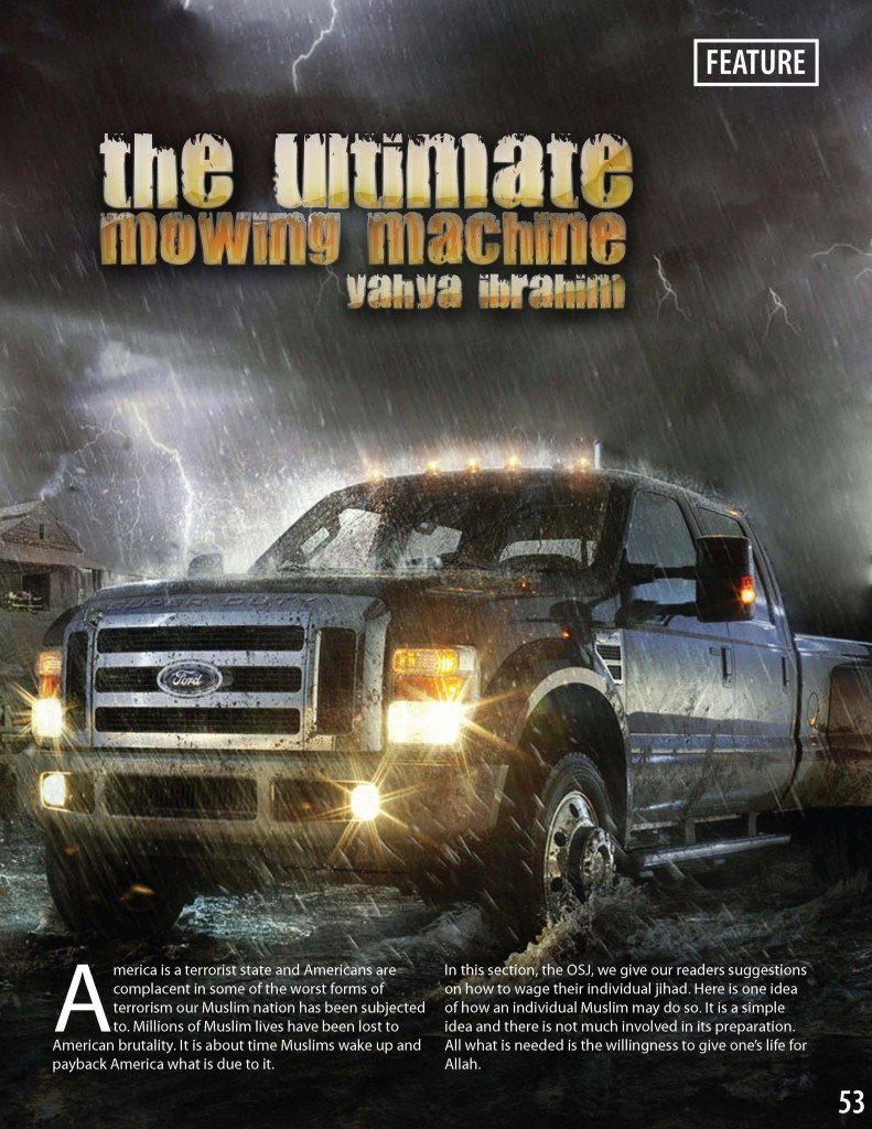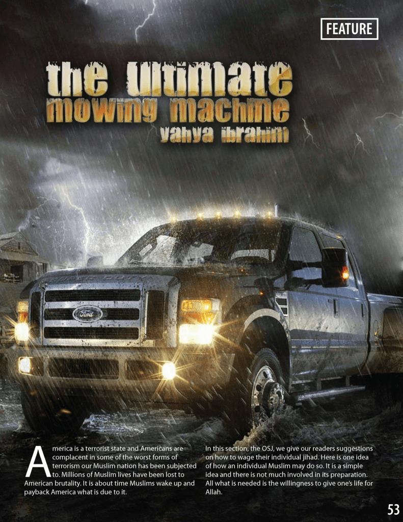 En otoño de 2010 la revista Inspire, publicada en inglés por Al Qaeda en la Península Arábiga sugirió el empleo de vehículos todoterreno con hojas de acero o cuchillos de carnicero fijadas en la parte delantera “no para segar hierba, sino segar los enemigos de Alá”. La revista sugería lanzar el ataque en vías peatonales de Estados Unidos, Reino Unido, Francia, Alemania, Holanda, Dinamarca y Australia.