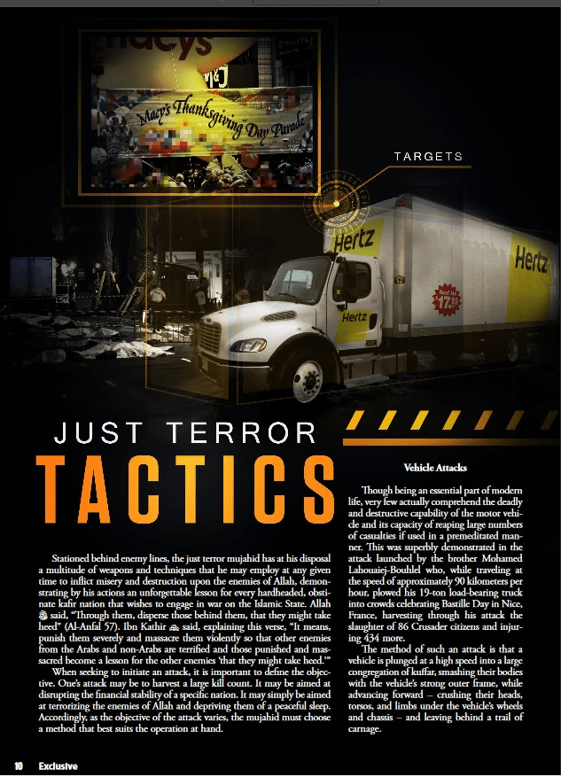 En dos ocasiones una publicación en inglés de grupos yihadistas ha ha llamado a sus simpatizantes a emprender ataques terroristas empleando vehículos.