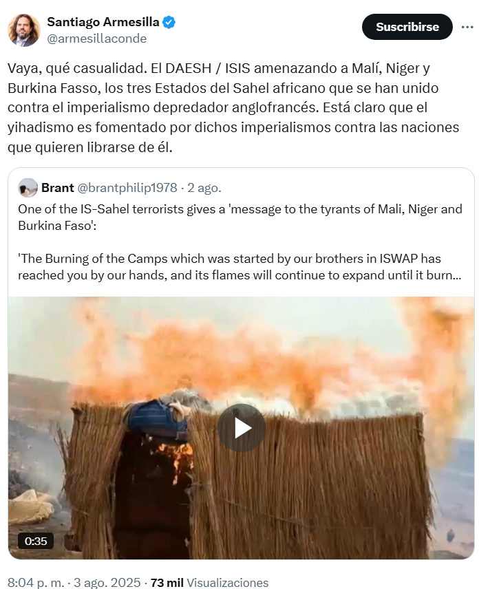 Parece que Santiago Armesilla Conde cree que la violencia de uno de los grupos sahelianos afiliados al Estado Islámico (el otro es el Estado Islámico del Gran Sáhara) apareció el otro día, tras la crisis de las relaciones de Francia con sus antiguas colonias en la zona. Pero también, parece creer que hay un antagonismo entre esos países y Occidente. Cuando la realidad es que las relaciones bilaterales, más allá de Francia, son normales o van camino de la normalización. Ahí tenemos el caso de las buenas relaciones de Alemania e Italia con Níger. O cómo Estados Unidos va camino de normalizar sus relaciones con los países de la Alianza de Estados del Sahel. Al respecto, véase en OSINT Sahel «Estados Unidos bajo el gobierno Trump reajusta su estrategia para África » y véase el hilo que estamos actualizando en X.com sobre la nueva estrategia del gobierno Trump para África. Yo le dejé un comentario a Santiago Armesilla Conde avisándole que patinaba en los asuntos sahelianos. Días después la publicación sigue ahí. Como no ha borrado o rectificado, me he sentido libre de llamar la atención sobre sus disparates.