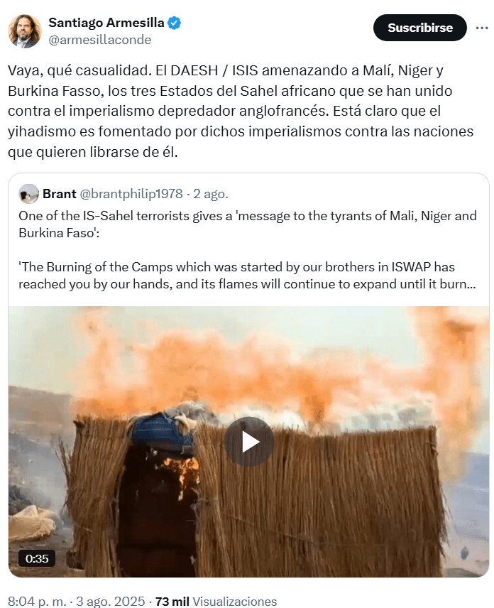 El pasado día 3 de agosto Santiago Armesilla Conde compartió una publicación en la red social X.com sobre la amenaza lanzada desde el Estado Islámico de la Provincia de África Occidental (conocido por sus siglas en inglés como ISWAP) contra Mali, Níger y Burkina Faso. Estos tres países están gobernados por juntas militares, han constituido la Alianza de Estados del Sahel, han cortado relaciones militares con Francia y han dado la bienvenida a personal militar ruso. Se trata de tres países cuya actualidad en materia de geopolítica y fuerzas armadas seguimos de cerca en OSINT Sahel, página web de la que soy coordinador. Por no hablar de mi anterior proyecto Flanco Sur, donde también traté el Sahel. Pero me desvío. Esos tres países han llegado a estar gobernados por juntas militares porque primero existió un hartazgo dentro de las fuerzas armadas ante el rumbo de los acontecimientos, enfrentados todos ellos a insurgencias de carácter salafista-yihadista. Una violencia que tiene ya larga duración. Y es que nada menos que fue allá por 2007 cuando se constituyó Al Qaeda en el Magreb Islámico. Pero Santiago Armesilla Conde parece desconocer el orden de los acontecimientos.