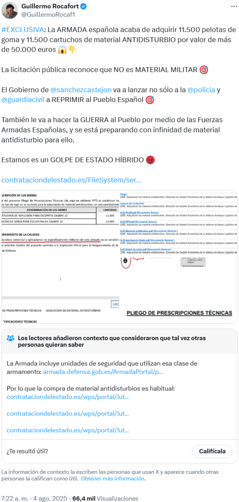 Según Guillermo Rocafort Pérez, esta compra de material antidisturbios por parte de la Armada española es inusual y sólo puede explicarse porque el actual gobierno pretende lanzar un «golpe de estado híbrido» (sic) para hacerle la «guerra al pueblo». Evidentemente, ignora que la compra de este tipo de material no es novedoso en las fuerzas armadas. No es cosa de este gobierno. Por ejemplo, podemos encontrar noticias de compra de material antidisturbios por parte de la Armada durante la presidencia de Mariano Rajoy (2011-2018). Véase la noticia «Más material antidisturbios para la Armada» publicada en 2017 en el portal defensa.com ¿Y para qué quiere la Armada, con sus barcos y submarinos, material antidisturbios? Pues porque dentro de la Armada encontramos a la Fuerza de Infantería de Marina y, dentro de ella, a la Fuerza de Protección, formada por los Tercios Norte, Sur y Levante, además de la Agrupación de Madrid y la Unidad de Seguridad de Canarias. Y todas estas unidades cuentan con material y formación para enfrentar disturbios dentro de las atribuciones que tienen en materia de seguridad de las instalaciones y personal de la Armada.