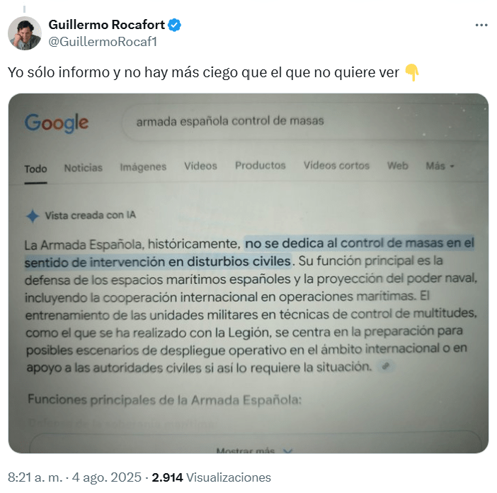 Tampoco hay que olvidar que dentro de la Infantería de Marina encontramos al «Tercio de Armada», cuya sección de Policía Naval también cuenta con material y formación específicos. El «Tercio de Armada» es una unidad expedicionaria que ha desplegado fuerzas en Bosnia, Haití, Líbano, etc. Las misiones internacionales en zonas de conflicto han sido escenario de manifestaciones violentas y altercados graves, como los propios infantes de marina que estuvieron en Haití saben. Por tanto, no hay que darle más vueltas a las compras de material antidisturbios por parte de las fuerzas armadas. Sin embargo, mis comentarios en X.com a su publicación no parecieron gustarle al señor Rocafort, que buscó ayuda en una Inteligencia Artificial. Y luego me sacó sus variopintas publicaciones como falacia de autoridad. Porque todo el mundo sabe que si has publicado libros sobre los almogávares o criticando al actual gobierno automáticamente eres experto en las fuerzas armadas españolas.
